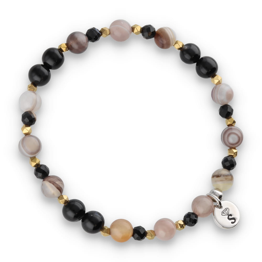 Bransoletka z kamieni naturalnych ze srebrem 925 łączy delikatne, pasiaste odcienie agatu z połyskiem hematytu. To bransoletka z agatu i hematytu, która podkreśla styl i harmonię – idealna zarówno na co dzień, jak i do bardziej eleganckich stylizacji. Dzięki elastycznej, silikonowej lince zakładasz ją bez zapięcia – łatwo, szybko i wygodnie. Naturalny agat w kremowo-szarej tonacji pięknie komponuje się z pozłacanymi akcentami, tworząc subtelną, kobiecą kompozycję. Idealna propozycja dla miłośniczek biżuterii z kamieni naturalnych i srebra 925.