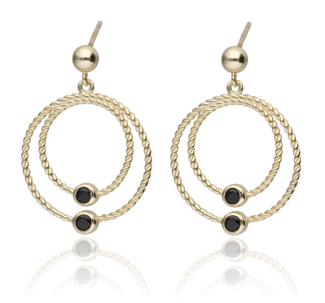 Kolczyki srebrne pozłacane podwójne koła z czarną cyrkonią