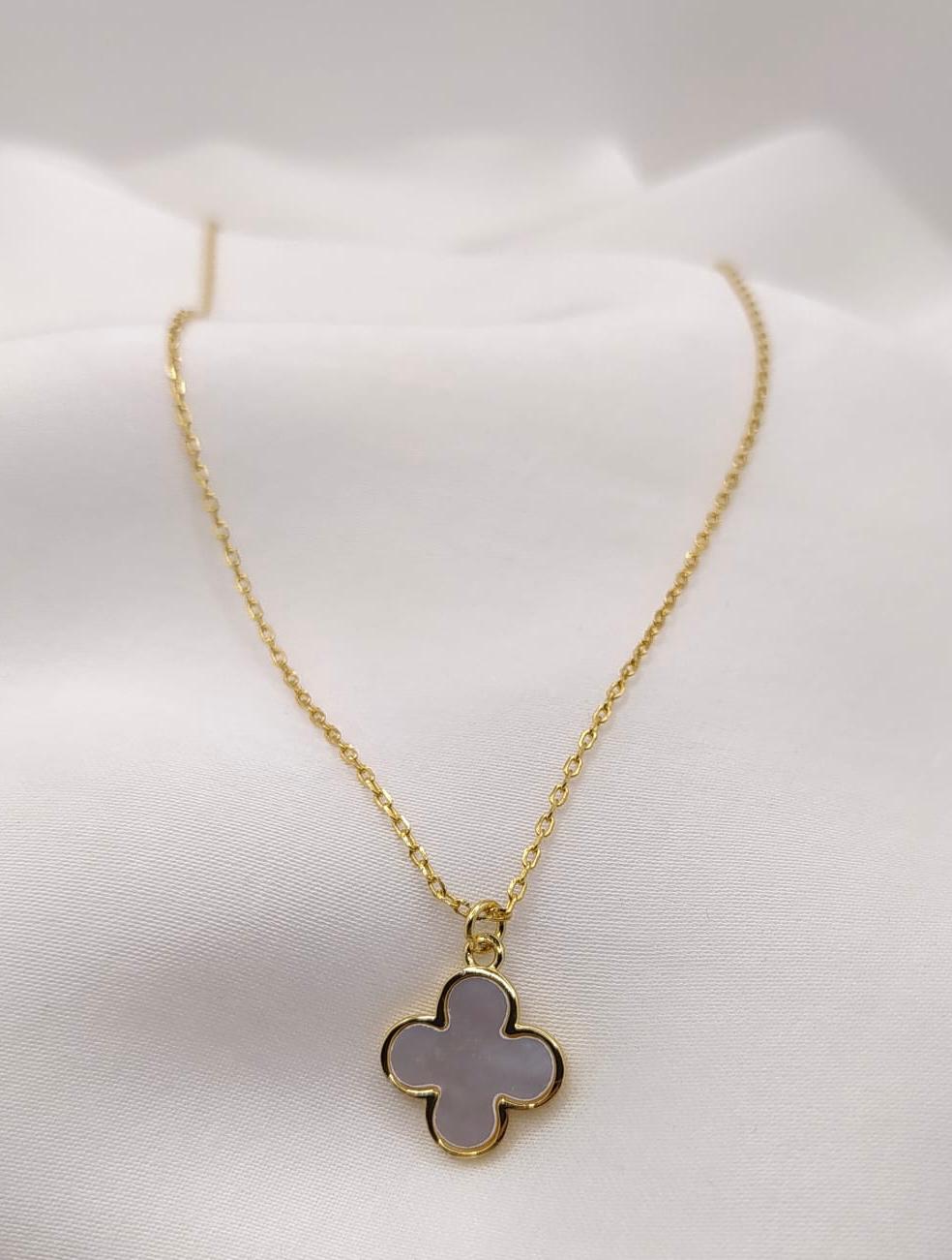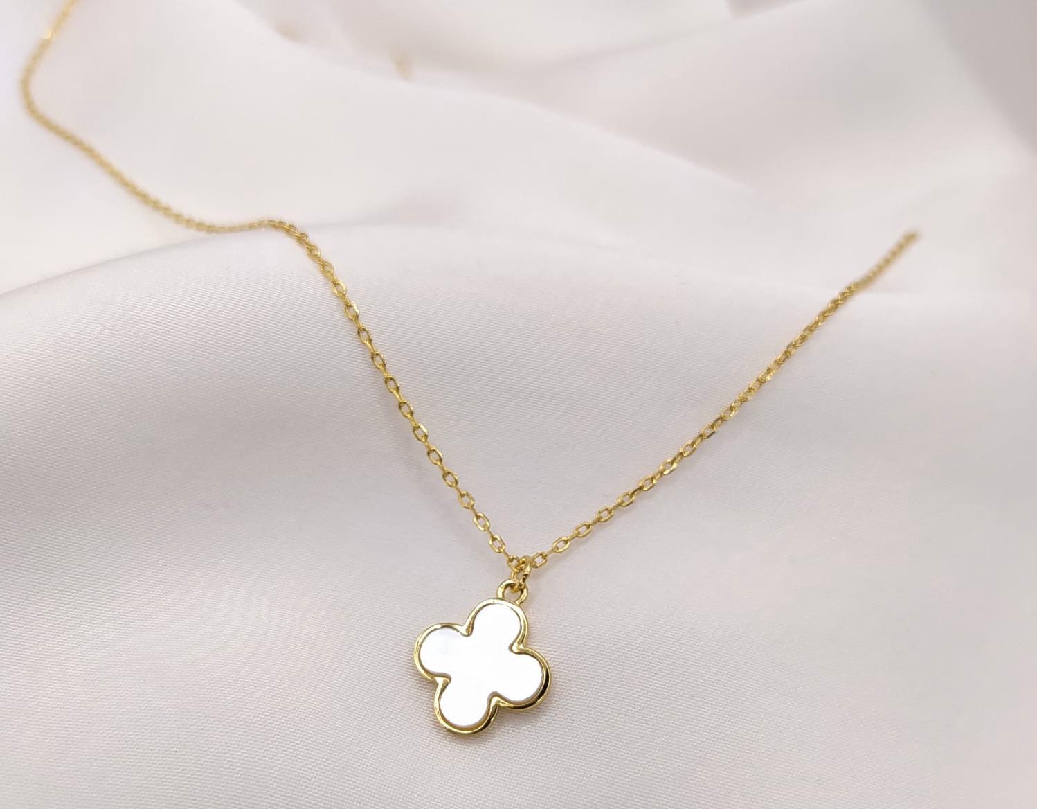 Łańcuszek srebrny pozłacany z wisząca koniczyną marokańską i masą perłową