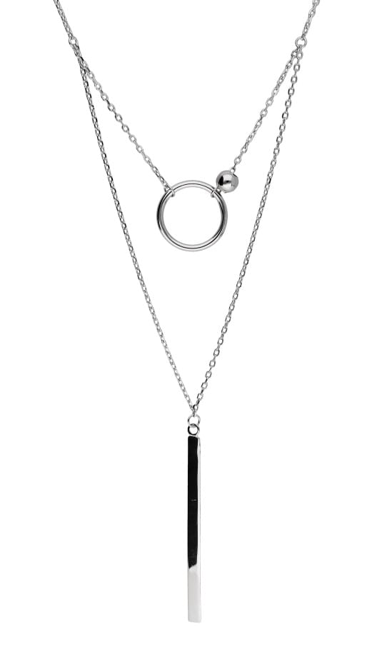 Naszyjnik srebrny o podwójnym splocie to propozycja dla kobiet ceniących subtelną, ale nowoczesną biżuterię. Dwa delikatne łańcuszki różnią się zawieszkami – jeden zdobi srebrne kółko, do którego od góry przymocowana została lśniąca, bezbarwna cyrkonia, dodająca blasku i elegancji. Drugi łańcuszek zakończony jest minimalistycznym soplem o smukłym kształcie, tworząc spójną, a zarazem kontrastującą kompozycję.