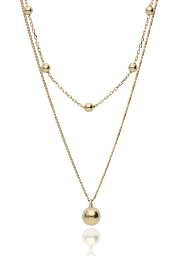 Zagraj dwoma liniami blasku dzięki naszemu pozłacanemu, podwójnemu naszyjnikowi. Krótszy łańcuszek, składający się z drobnych, połyskujących kuleczek, delikatnie otula szyję, tworząc subtelny pierwszy plan. Dłuższy łańcuszek, swobodnie opadający nieco niżej, zakończony jest pojedynczą, większą kulką, która stanowi elegancki i wyważony akcent.