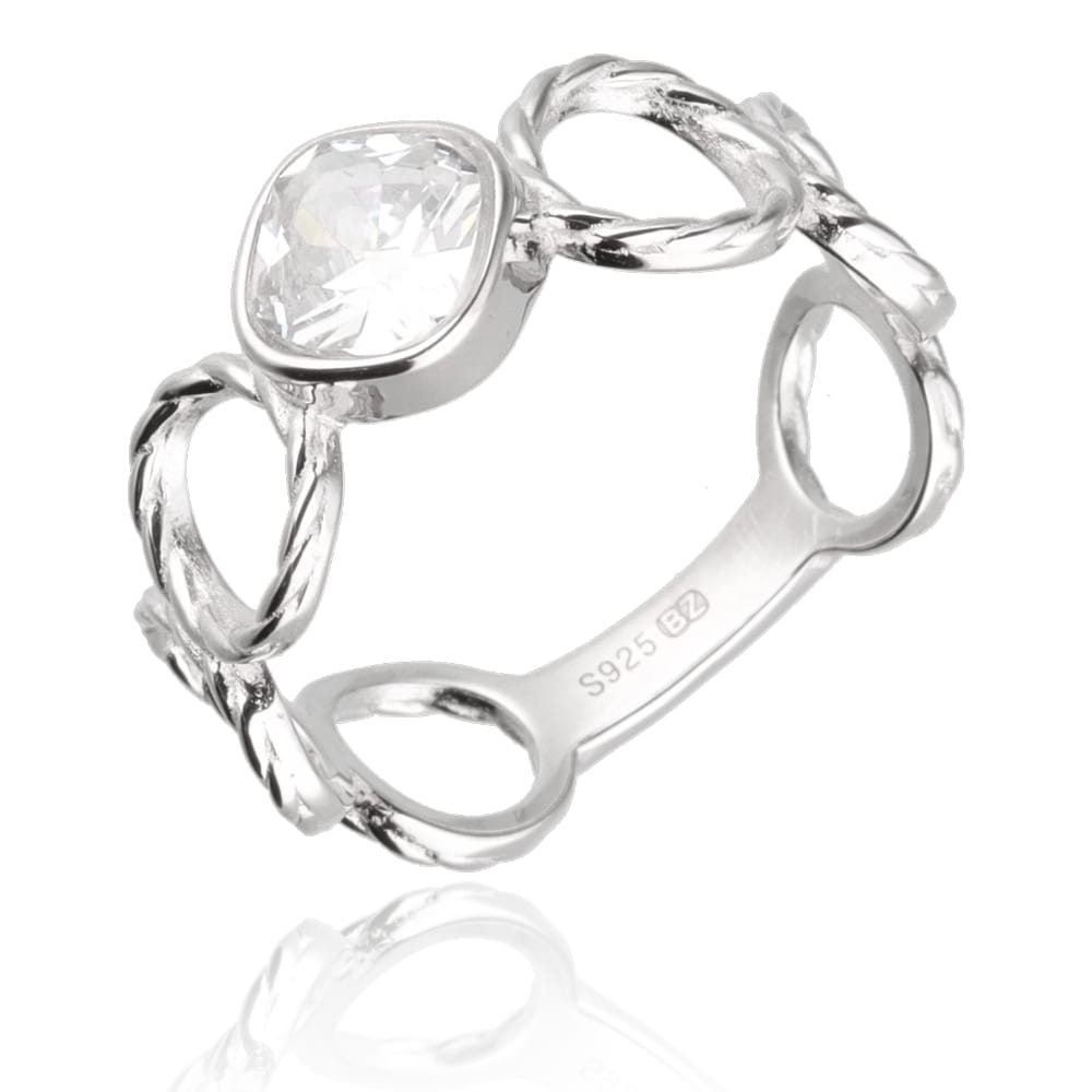 Pierścionek srebrny skręcone koła z cyrkonią